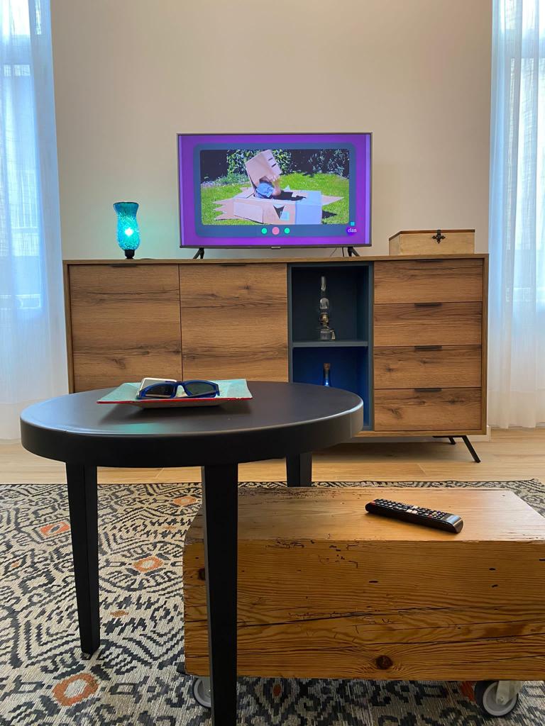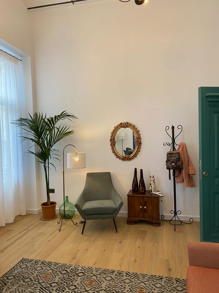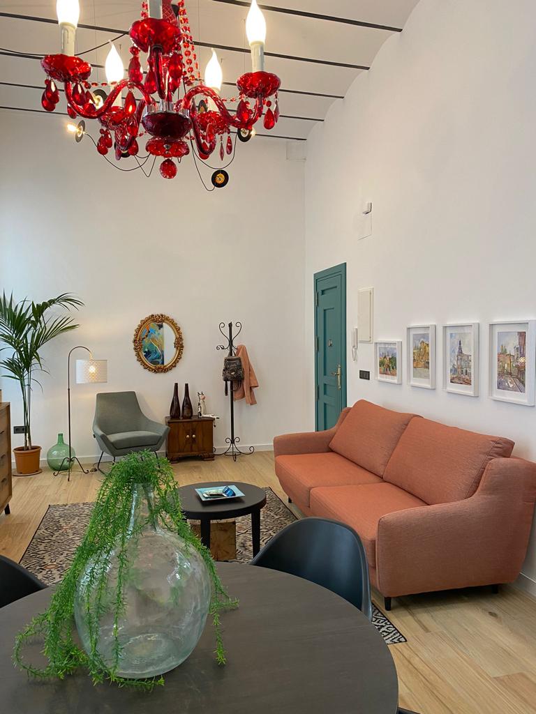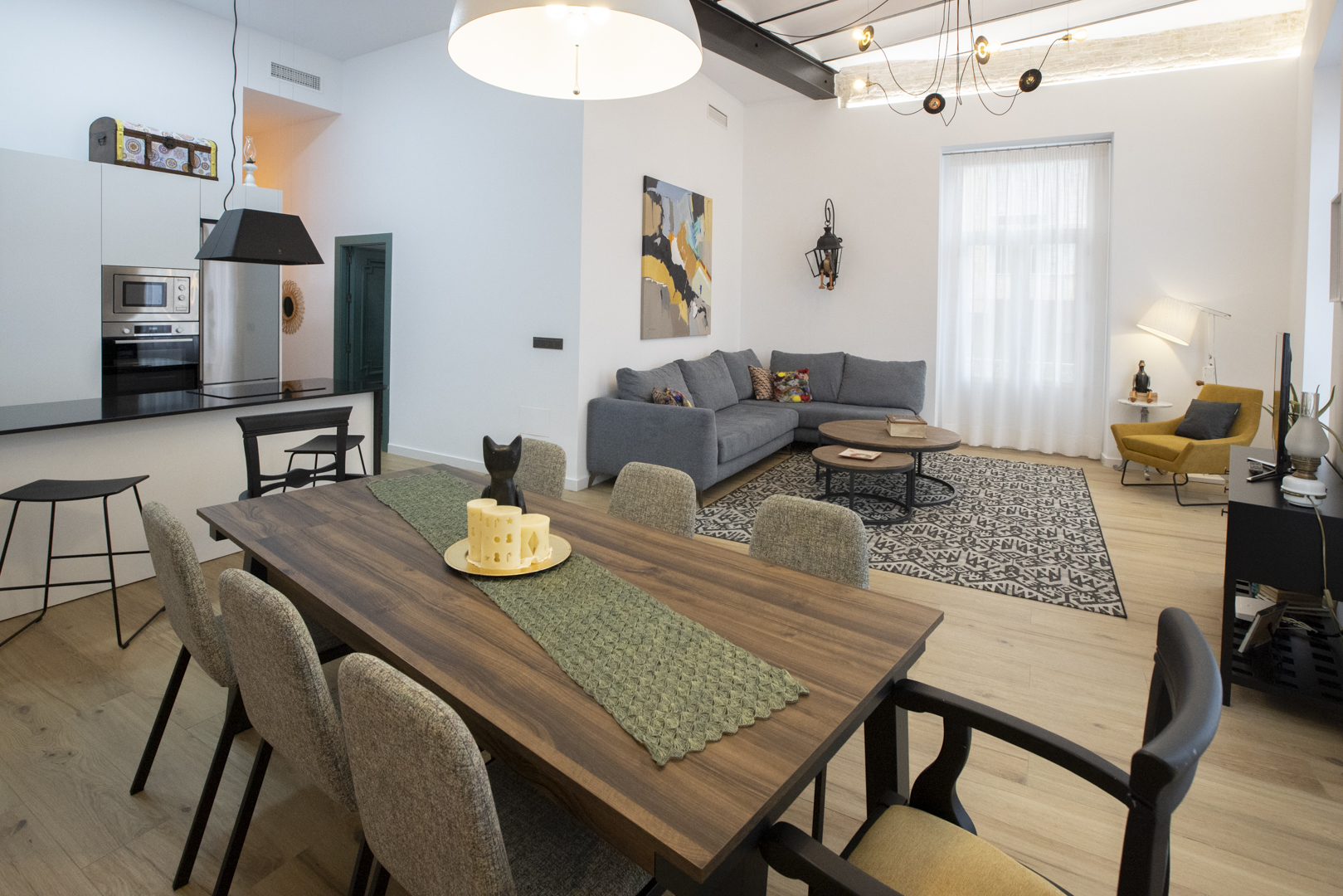 • Un amplio salón-comedor de 35 m2 con techos altos y un cómodo sofá, convertible en cama.