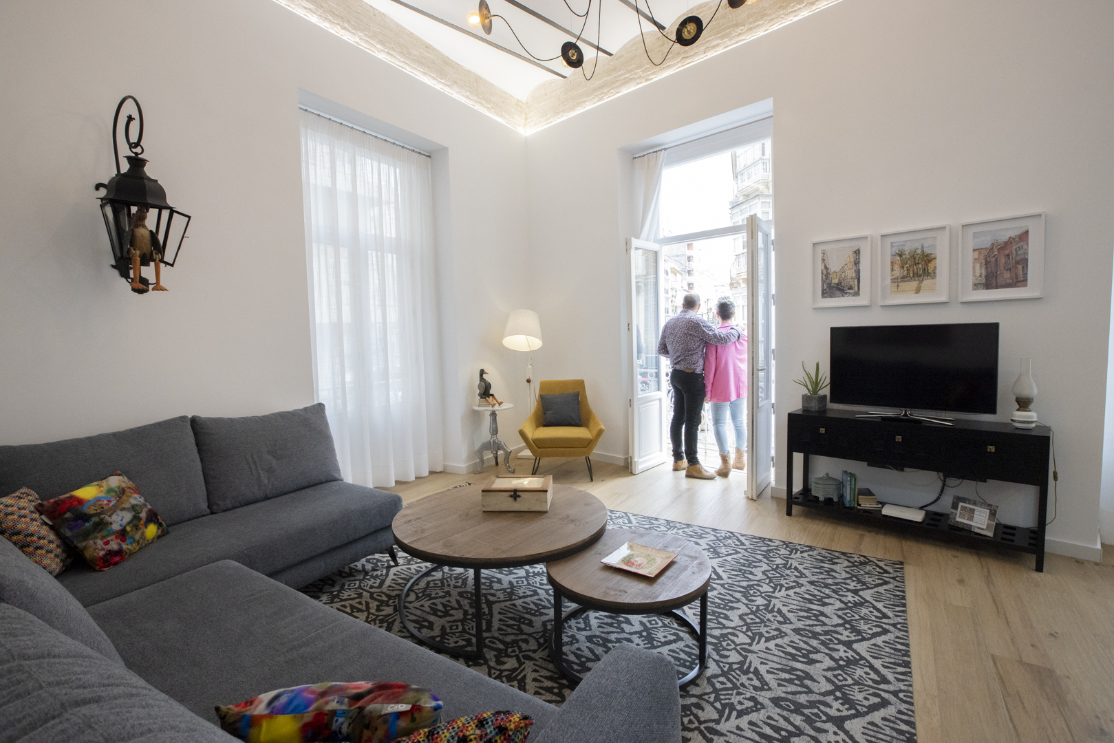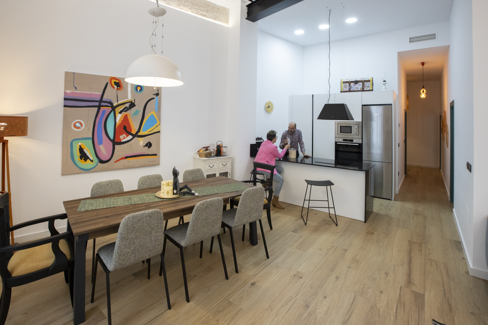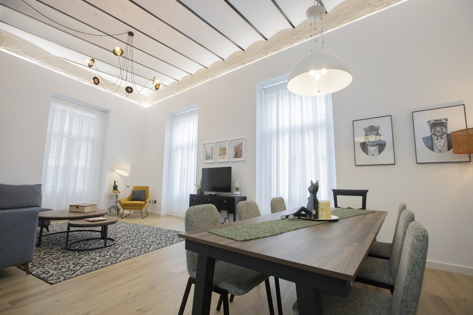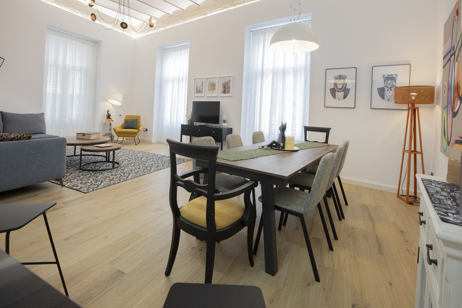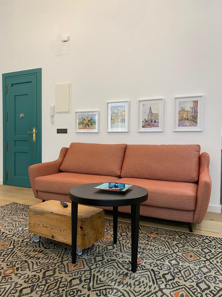 - Un amplio salón-comedor de 35 m2 con techos altos y un cómodo sofá, convertible en cama.